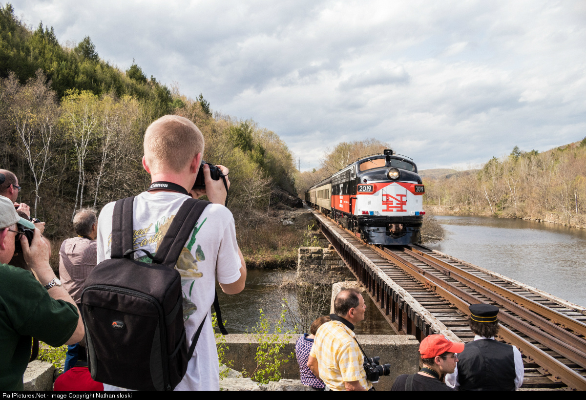 A group of railfans take photos of NH 2019 as it sits on a bridge over the Naugatuck River in Waterbury, CT.