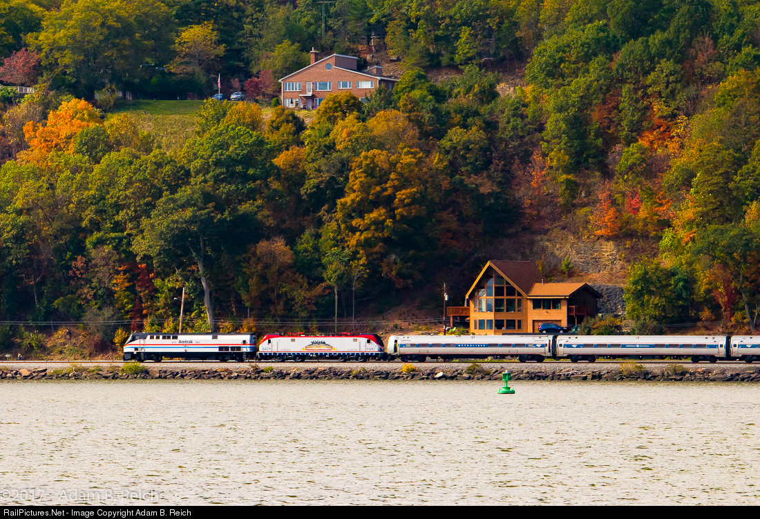 Autumn Express with Fall Colors: Heritage P42DC #145 and Veterans ACS-64 bring up the rear of Amtrak's Autumn Express on CSX's River Subdivision in Highland, New York. This portion of the line has not seen regularly scheduled passenger service since 1958. Photo taken from Victor C. Waryas Park on the Poughkeepsie side of the Hudson River. Note the photographers peeking out of the doors of the first passenger car.
