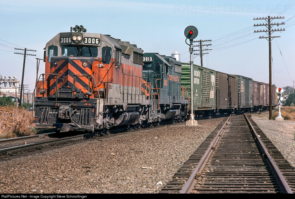 A pair of GP35s lead a westbound WP manifest through El Pinal in October 1974. El Pinal is where the WP crossed SP's Valley Line between Bakersfield and Elvas Tower in Sacramento. In another couple of miles, this westbound will head into WP's Stockton Yard.