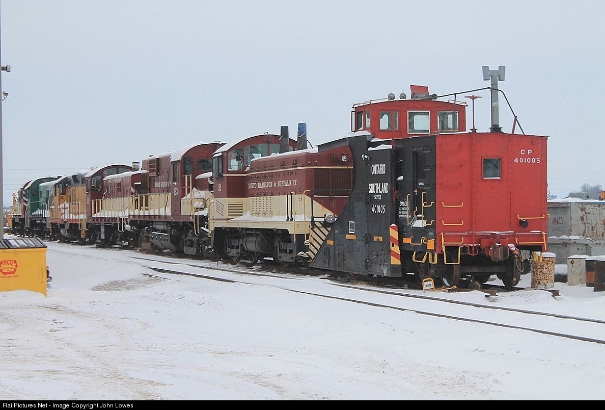 On a very wintry day the motive power is lined up to the rear of the shed with the snowplow. Note the second loco in TH&B livery:- NW2 #51.