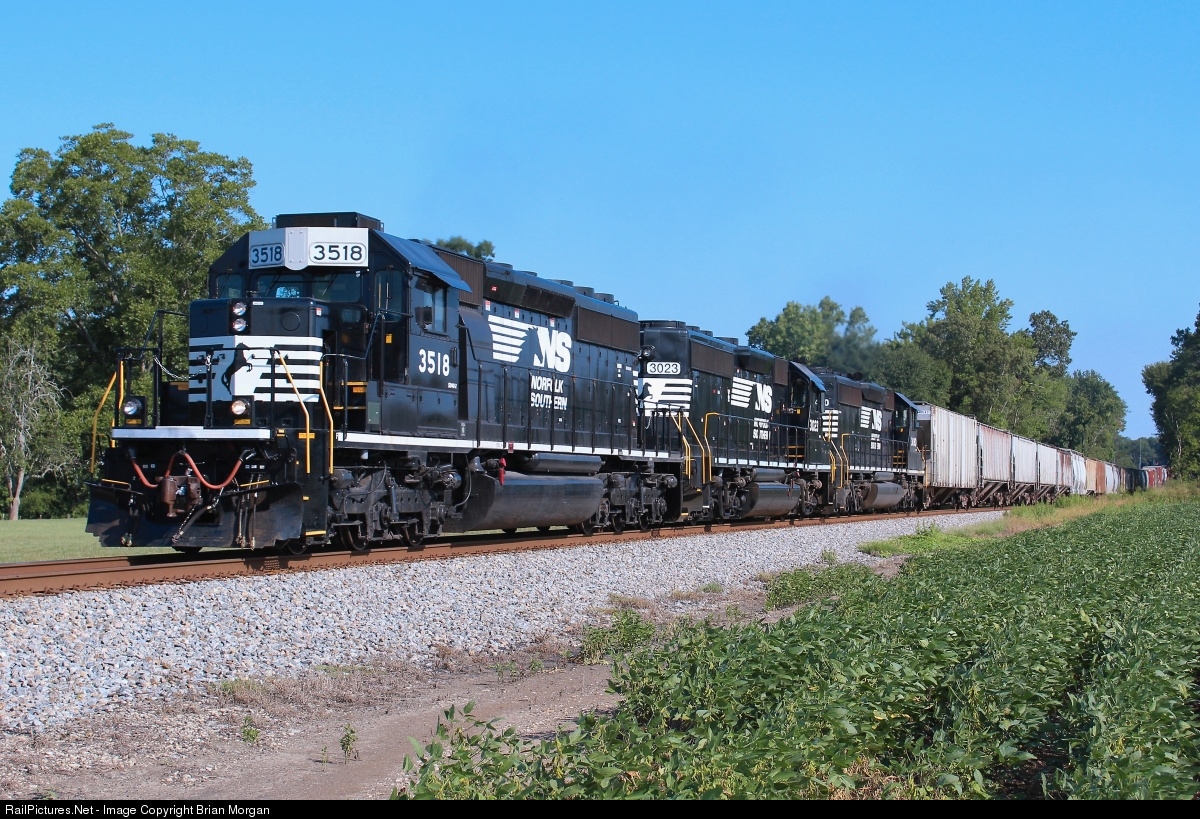 Southbound Norfolk Southern manifest train #371 rolls through the Oostanaula Bend Loop grade crossing just south of CP "Hall", milepost 61 of NS's Atlanta North District, approximately six miles south of Sugar Valley, Georgia behind NS SD40-2 #3518, NS GP40-2 #3023, and NS SD40-2 #3490.