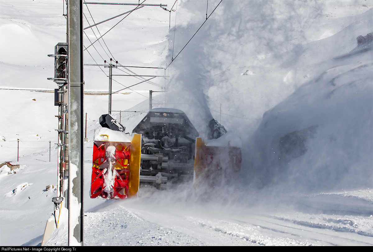 | "La Bestia" or "the beast" snowblower Xrot mt # 95403 from Zaugg/Eggiswil was rather new in january 2012 and it was the first winter of it's operation on the Bernina line. Shoved by dual power (diesel and electro) locomotive Gem 4/4 # 802 the new snow blower is clearing the right of way with widened blower units. |