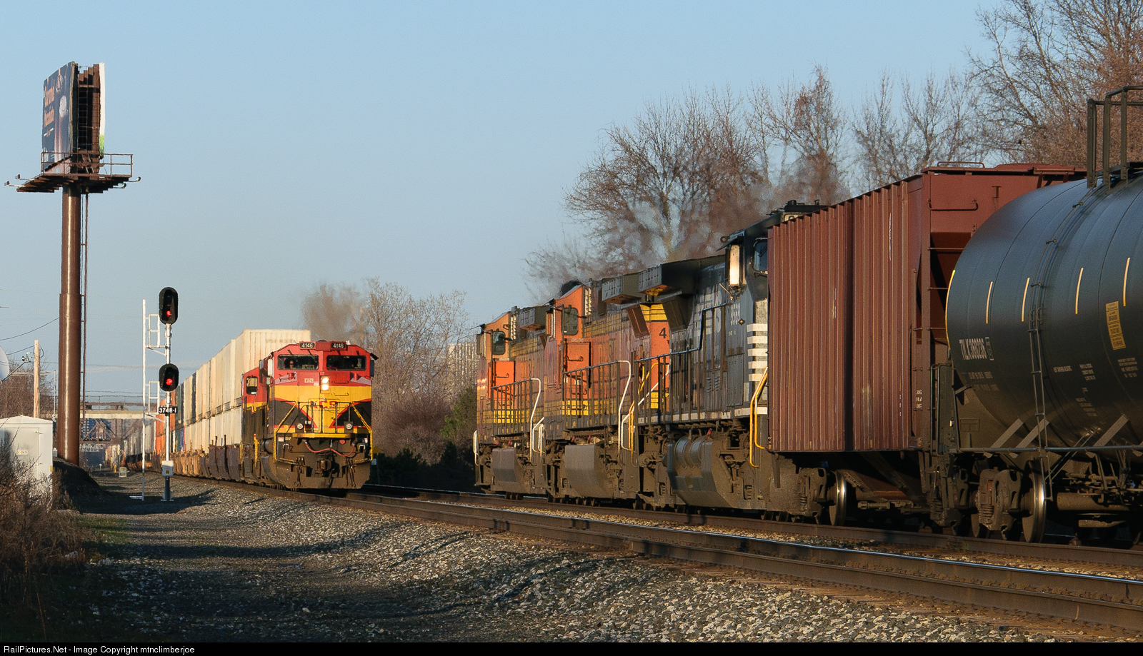 Who's railroad is it anyway? CSX intermodal train Q003, led by a pair of KCS locomotives, meet an eastbound CSX ethanol train with BNSF and NS power in Rochester, NY.