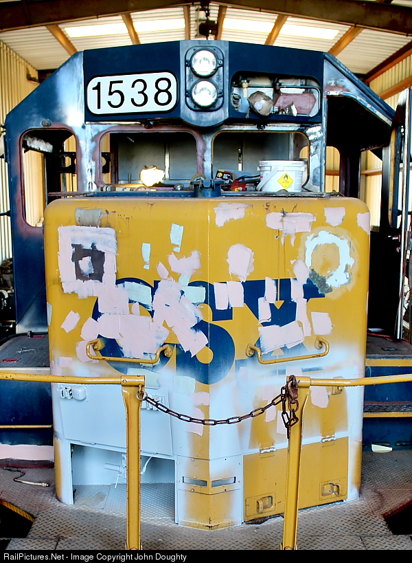 | Another in the series "A face only a mother could love", former CSX GP15-1 1538 is getting a "facial makeover" by the crew at Locomotive Specialists. Lots of bondo on the nose as well as paint overspray when the inside compartments in the nose were completed. Once the rebuild is complete, the engine will appear in LOSX markings. Photo taken with permission. |