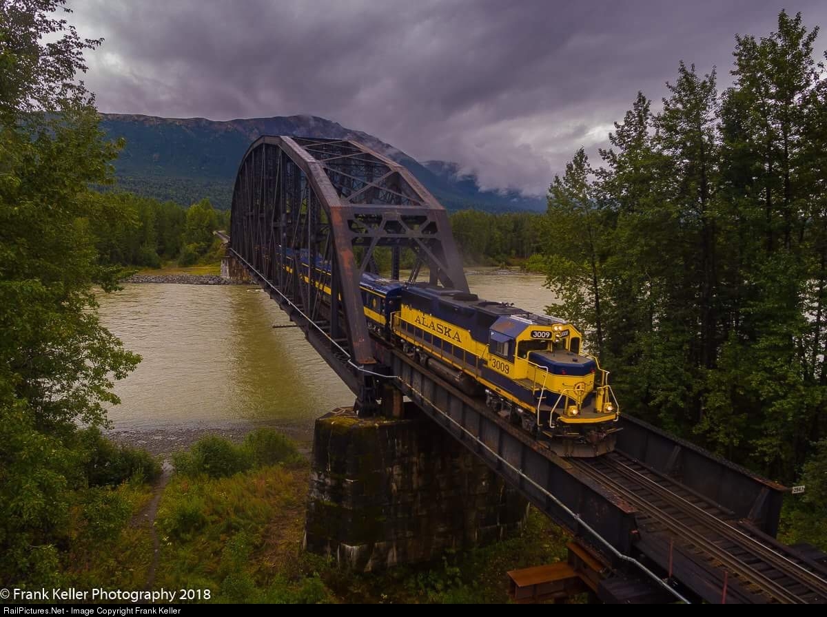 | The Alaska Railroad’s Hurricane Turn crosses the Susitna River at Gold Creek. in a very remote part of the railroad. No roads in this area. The only way in is the Railroad or bush plane. Gold is still actively mined at this location. While the day wasn’t pretty this is my only shot of this bridge and it took some doing to get this one. |