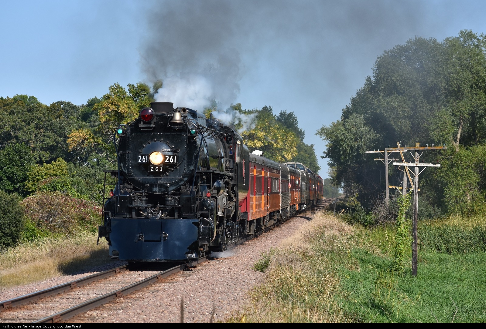 Milwaukee Road 261 heads west to Glencoe in the outskirts of Plato on the ex Milwaukee Road mainline to the Pacific Northwest. Back when 261 was in service on the Milwaukee Road, trains went 90 through here, now it's a max. speed of 30 on jointed rail.