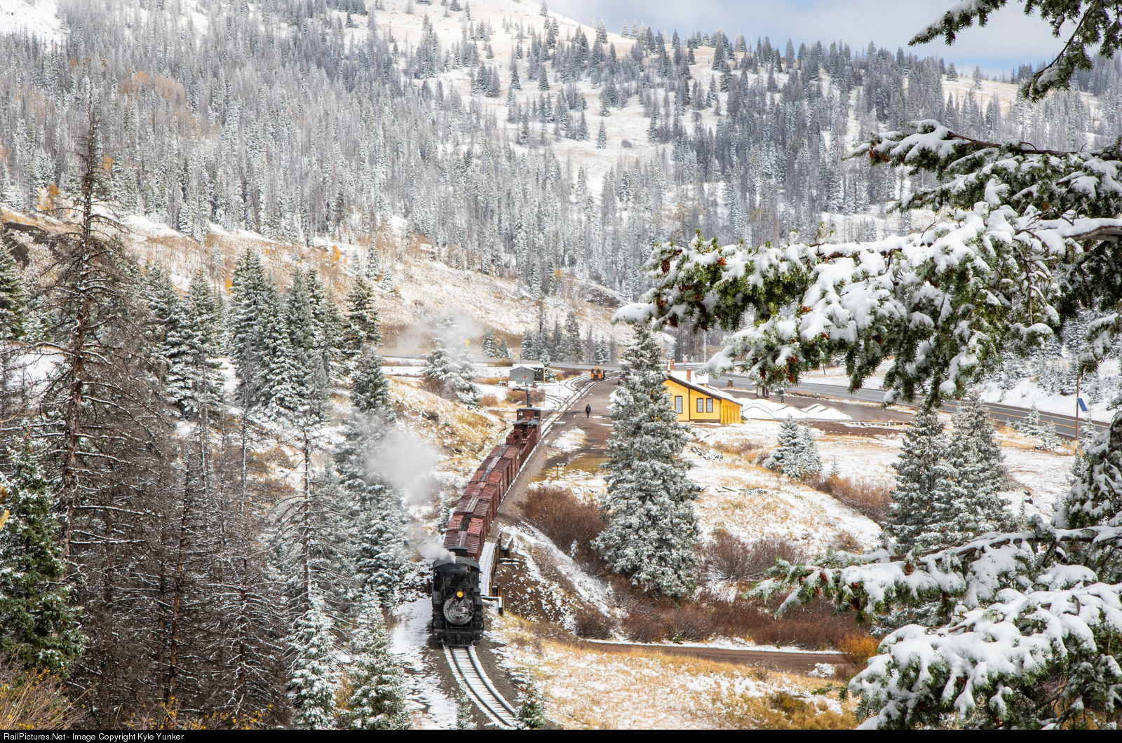 We're just over 10,000 feet high in elevation here at the top of Cumbres Pass in southwestern Colorado just after a 40 minute snow squall had come through. Below is a Cumbres & Toltec Scenic freight beginning its descent down the mountain towards Chama,NM.