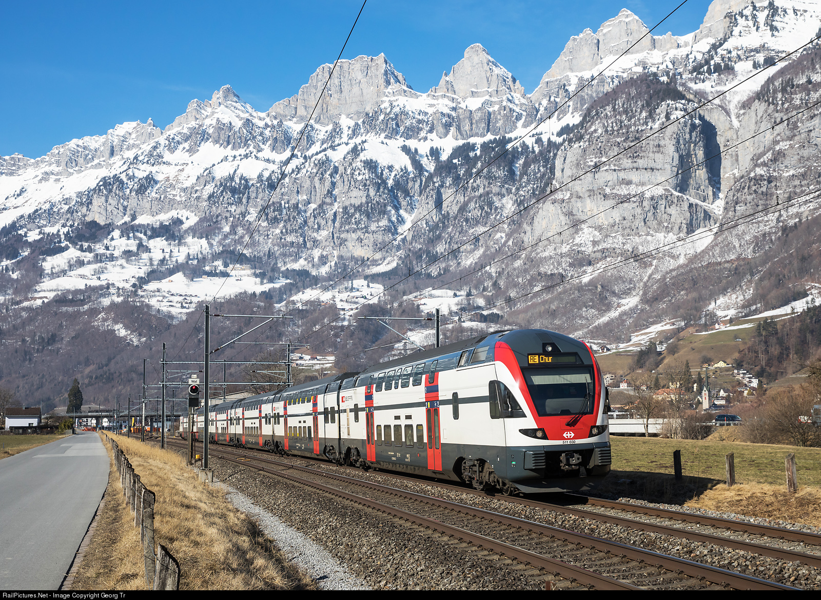 Doubledeck train for regional traffic (RV-Dosto) or Stadler "KISS" RABe 511 # 030 of the SBB is running the Regio Express 3471 from Zürich to Chur, between Walenstadt and Flums, with the Churfirsten mountains (from left Frümsel, Brisi, Zuestoll, Schibenstoll) in the background.
