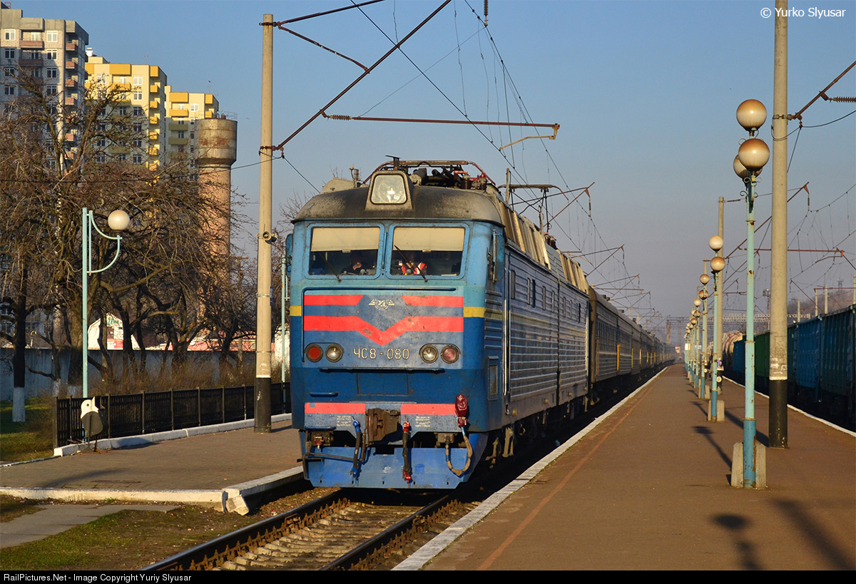 The electric locomotive CHS8-080 with passenger train #149/150 Vorokhta - Kremenchuk arrives to Boryspil' station at approximately 7:58 am. This passenger electric locomotive built by Škoda in December, 1989, and have serial type Škoda 81E2 and serial number #8596.