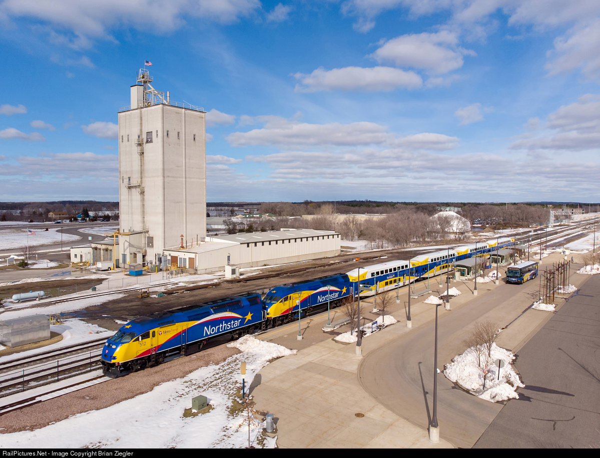 | The last afternoon Northstar commuter train of the day waits to depart east to Target Field in Minneapolis. The Northstar Link bus will shuttle commuters to St. Cloud. In the background is Cargill's Animal Nutrition facility. |