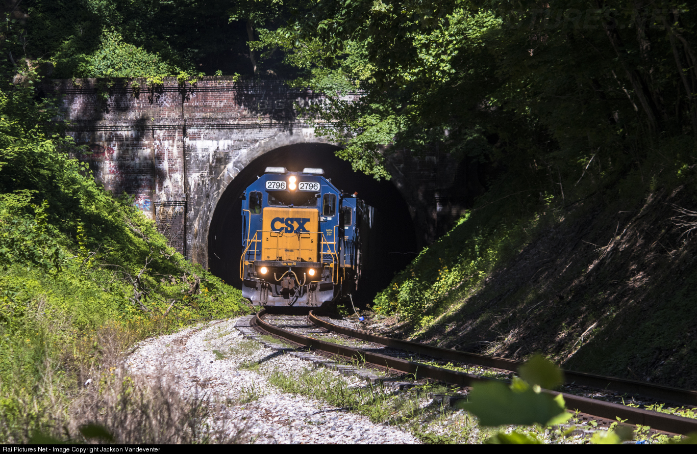 Here at "Big Tunnel," eastbound CSX J780 appears from the darkness behind a pair of CSX GPs. |