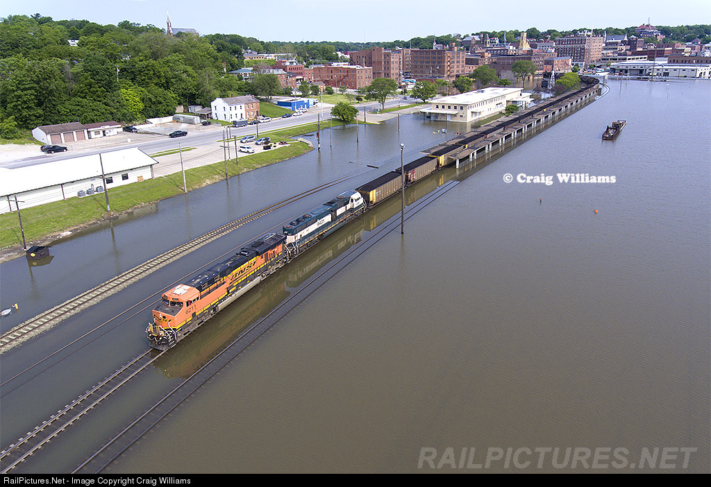 An eastbound coal train sneaks thru the high water in downtown Burlington. The Mississippi River crested on June 2nd at 24.48 feet. The crest was the 3rd highest crest on record with the record of 25.73 feet set in 2008. Most of the rail head was above the around the Amtrak depot here. One spot the cars were still kicking up a small waves behind me. The dispatcher was also cancelling the 5 mph slow order thru this area for all the trains. The coal train is working between Creston, IA, and Galesburg, IL, the next crew change point. The load is bound for a plant at Bladwin, IL.