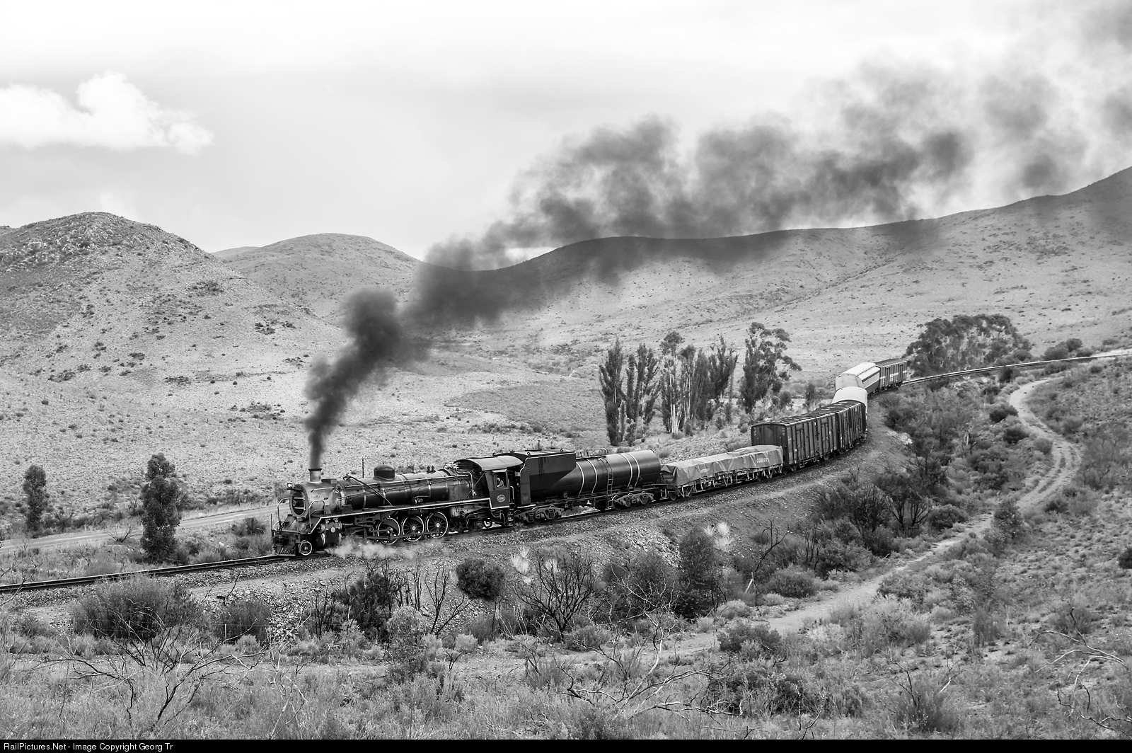 Fuel oil fired 4-8-2 steamlocomotive 19D # 3322 of the South African Railway (SAR), now owned and operated by the Ceres Rail Company, is tackling the heavy grade between Bonnievale and Ashton on the former New Cape Central Railway line from Voorbaai to Worcester. A classic mixed freight/passenger consist for FarRail Tours of Bernd Seiler, perfectly organised by the Ceres Rail Company of Derrick du Toi. The 19D # 3322 was built in 1948 by the North British Locomotive Works for the South African Railways (SAR). It was of the final batch of fifty Class 19D locomotives for the SAR,, delivered in 1949 by the North British Locomotive Company (NBL) of Glasgow, Scotland and numbered in the range from 3321 to 3370. These engines were delivered with Type MX Torpedo tenders.