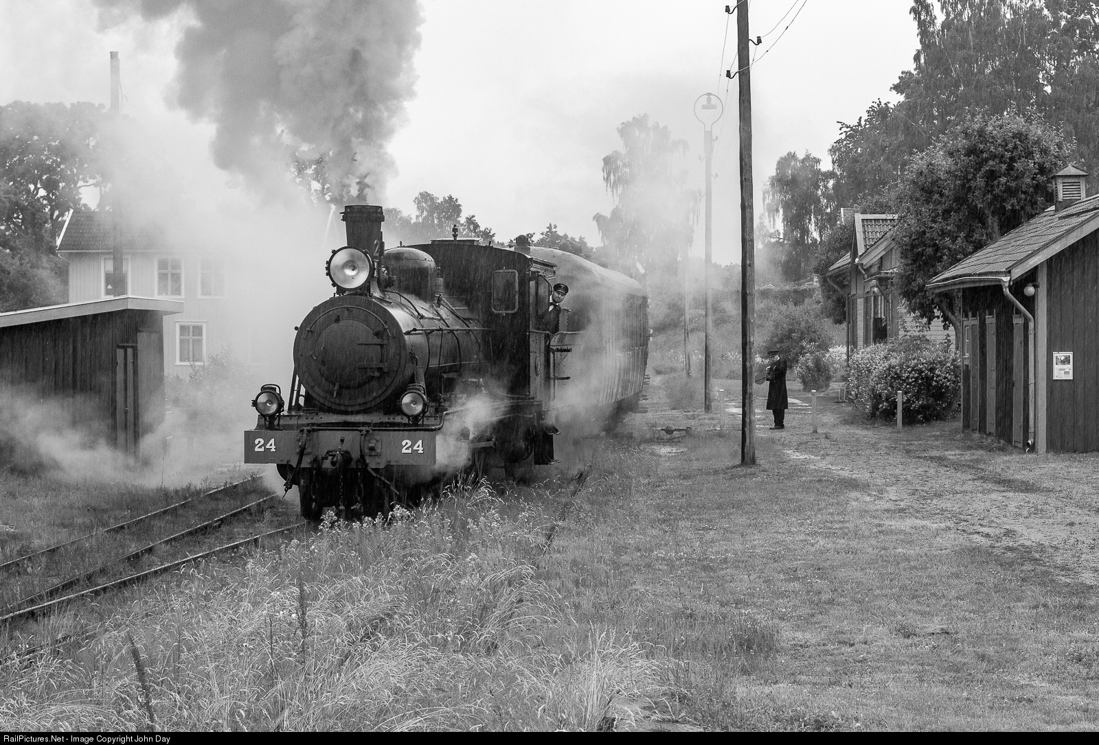 In the little country station of Kvarnabo, 1911-built 4-6-0 No. 24 departs after a station stop that saw no passengers get on or off. The torrential rain may have seen to that. This remnant of the once large 891 mm gauge (2' 11-1/13") Västergötland – Göteborgs Järnvägar system was running a special service for a Medieval Knights' Tournament, but the foul weather put a huge dent in ticket sales. Nonetheless, for a brief moment in time, I was able to enjoy a scene that could equally have been in 1950 as 2019, and now share it with you.