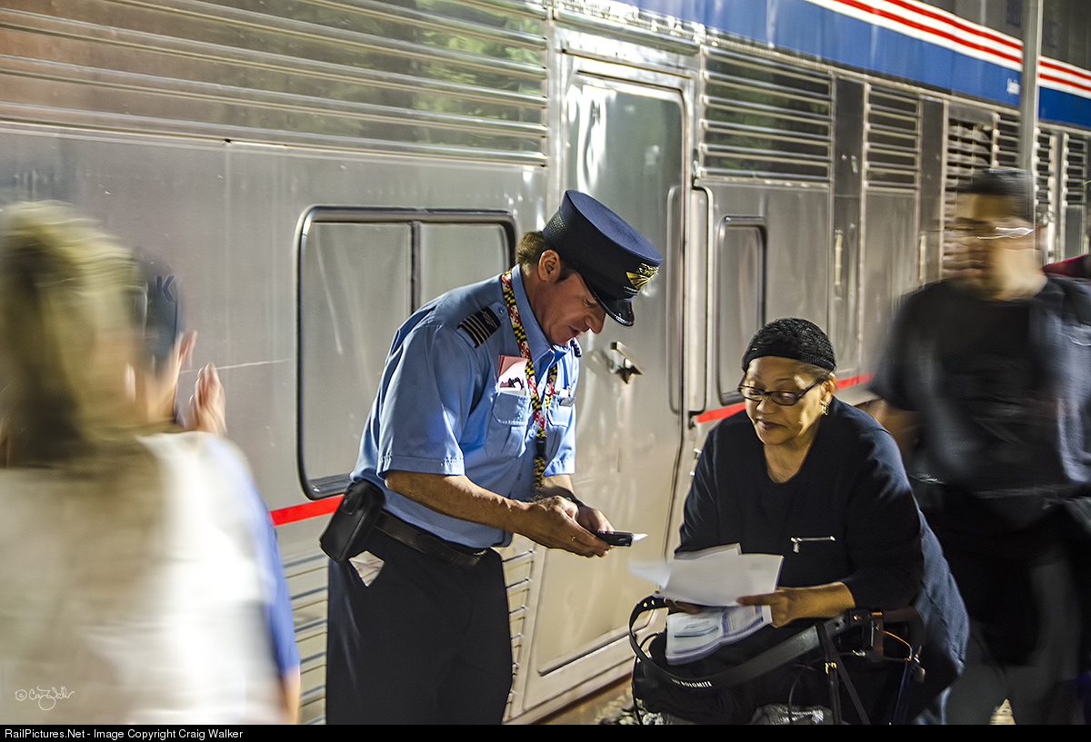 The conductor on Amtrak 4, the eastbound Southwest Chief, checks the tickets of sleeping car passengers boarding in Victorville, California, on July 10, 2019. This may be the train heading from Los Angeles to Chicago, but it appears that this conductor may be from Maryland.