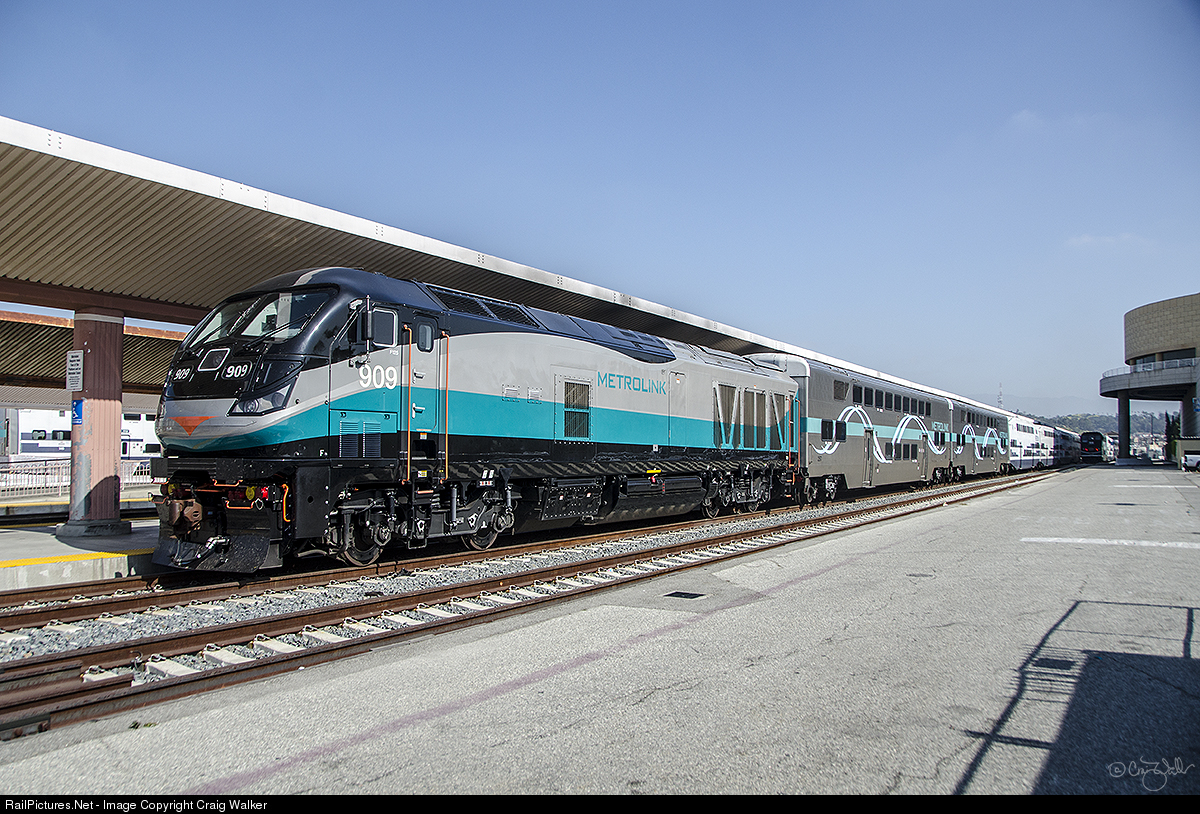 Metrolink train 685, which originated in Laguna Niguel/Mission Viejo (in southern Orange County) has arrived on Track 14 at Los Angeles Union Station on April 22, 2019. As with most Metrolink trains, the cars that F125 909 pulled was a motley mix of original Canadian-built Bombardier coaches (and former cab cars) and Korean-built Hyundai Rotem coaches with a HR cab car are on the other end of the train. So far, Metrolink is the only owner of EMD F125 locomotives.