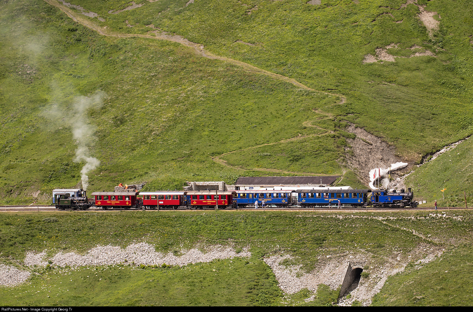 Crossing of two steamtrains of the steam railway Furka Mountain line (Dampfbahn Furka Bergstrecke) on the highest station of the line, Furka DFB on 2160 meter a.s.l., on the east portal of the Furka summit tunnel. The small green HG 2/3 # 6 "Weisshorn" from 1902 was already turned on the turntable and is ready for departure with the red train 139 "Gletscherzug" from Realp to Gletsch. The "Blue Train" 134 from Oberwald to Realp is pulled by HG 3/4 # 1 "Furkahorn" from 1913. In the background the hiking path up to the Furka pass road. There is no road to Furka DFB station.