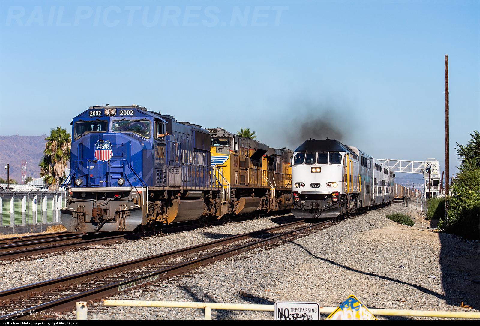 An Olympian Tells Metrolink to Hang Loose. With their train built and ready to roll, the crew of Union Pacific;s LOF67 has some time to kill as they sit just shy of CP Elicker, located north of Gemco Yard. While today's train might be ready to highball, the time it took to build today's consist has unfortunately (for the crew, not for this photographer) landed the LOF67 right in the middle of Metrolink's afternoon rush. In an effort to keep the many commuter trains moving without delay, the Metrolink Valley/Ventura Subdivision Dispatcher has informed the 2002 that they will need to wait until Metrolink 119 passes them...at which point they'll be able to follow that train north. During this waiting period in their air conditioned cab, perfect for a hot afternoon like today, the 2002's crew gives passing trains a roll-by. In the case of Metrolink 117, pictured here on the right, a friendly "hang loose" sign is shown and is returned by the Metrolink engineer's wave from the windshield of SCAX 895.