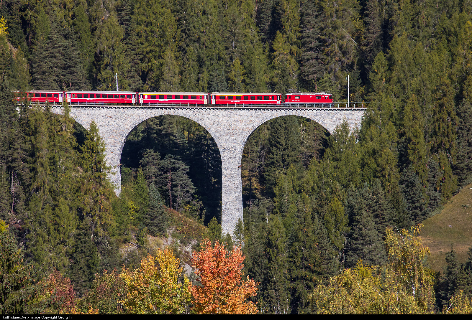 Ge 4/4 II # 631 "Untervaz" is pulling the regional train 1229 from Disentis via Landquart to Scuol-Tarasp over the 136 meter long and 53 meter high Val Püzza viaduct near Ftan Baraigla. This vaduct has 4 bows of 27 meter span each.