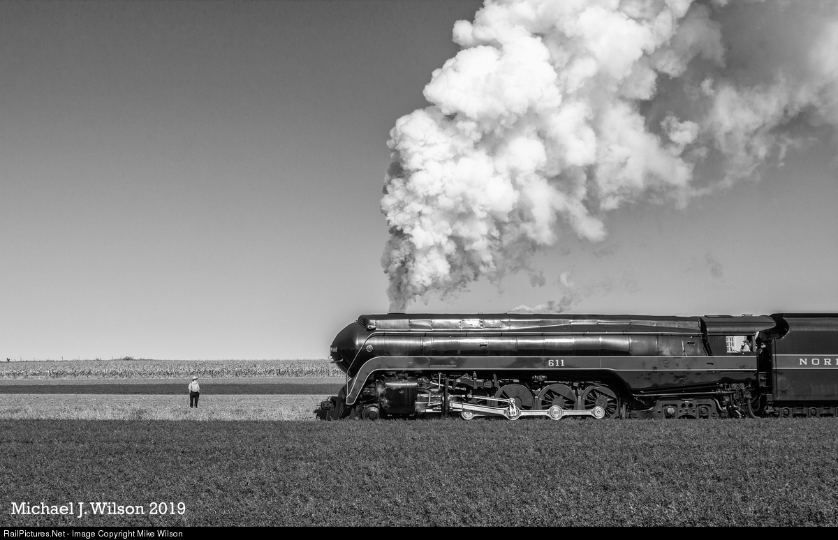 "Standing in Awe": A local Amish farmer gazes at N&W J Class locomotive #611 as she chugs by his position along Long Curve outside of Paradise, Pennsylvania. For some families who, for generations, have lived along these tracks within ear shot of a steam locomotive, the presence of a 300 psi 1950 J Class locomotive makes all the difference in their day!