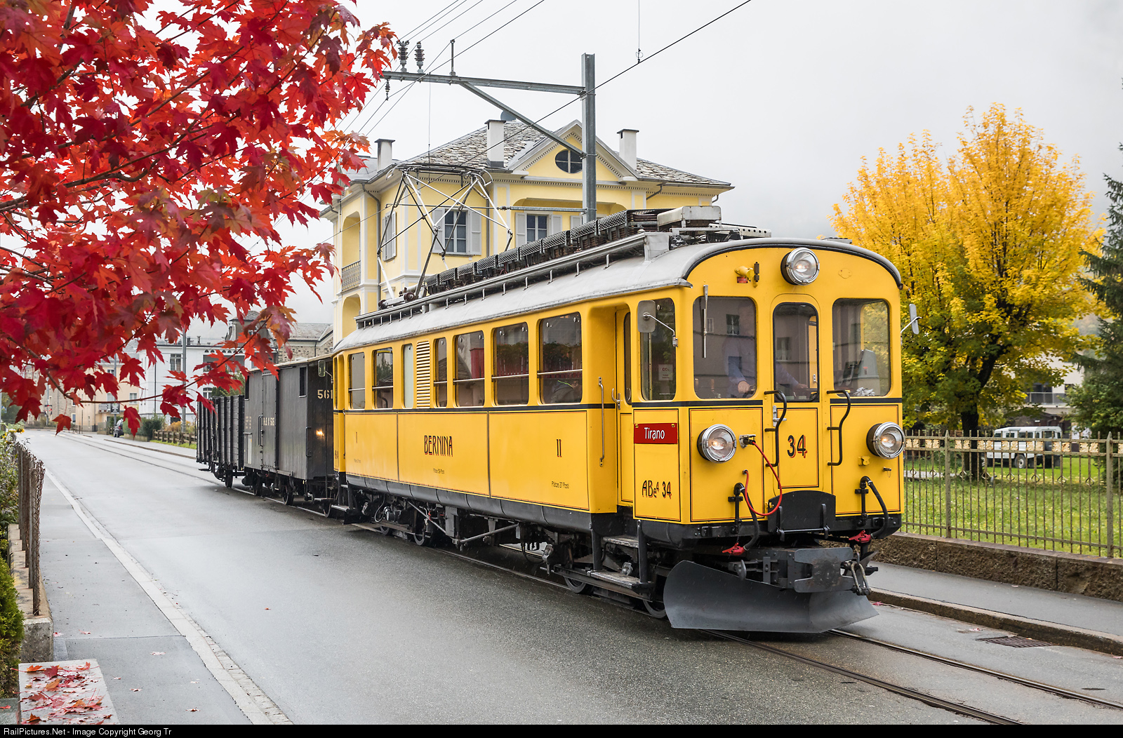 | Through the village of Le Prese, the Bernina line of the Rhaetian Railway is following the main road for some hundred meters. Railcar ABe 4/4 # 34 from 1908, built for the then independent Bernina Railway as BCe 4/4 # 4, is street running through the village with two freight cars bound for Tirano. A RM photo charter ("Meier's walking tour"). |