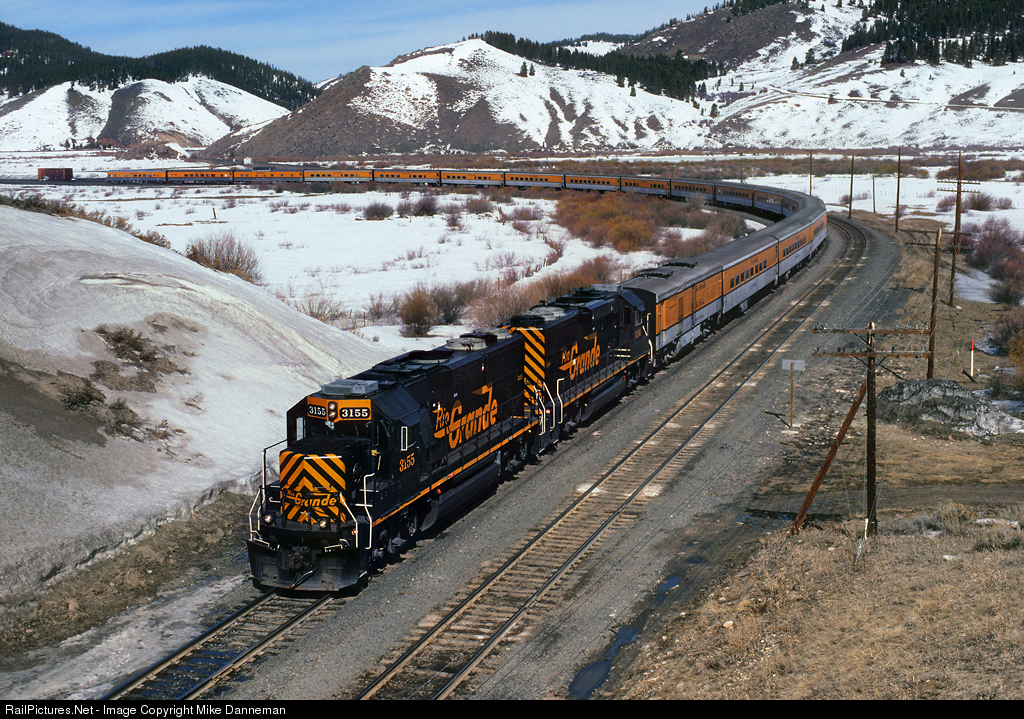 The Rio Grande Ski Train has finished turning on the wye at Tabernash, Colorado, and is now heading east to Fraser on March 22, 1997. The 18-car train is powered by Rio Grande GP60 Nos. 3155 and 3156, and includes a former Alco PB now rebuilt into steam a generator No. 253.