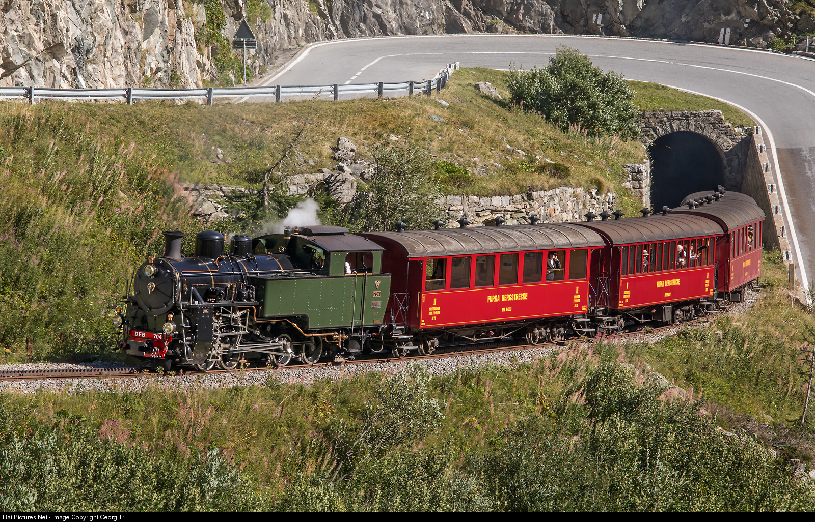 Cogwheel steamlocomotive HG 4/4 # 704 of the Dampfbahn Furka Bergstrecke (DFB) with a passenger train above the Gletsch spiral tunnel.
