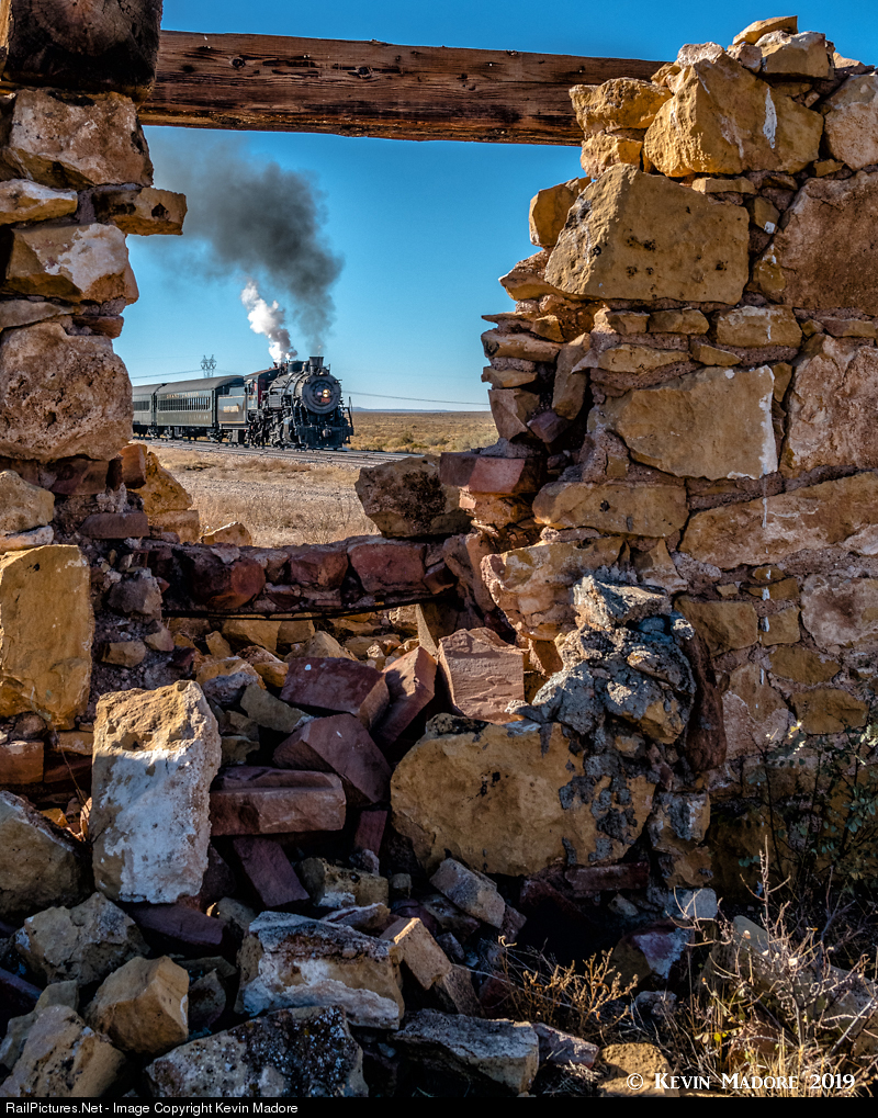 AT&SF Archaeology. Framed by the ruins of a decaying Atchison, Topeka and Santa Fe Section House at Willaha Siding, Grand Canyon Railway Locomotive #29 highballs north to the Grand Canyon Village with a short passenger special.