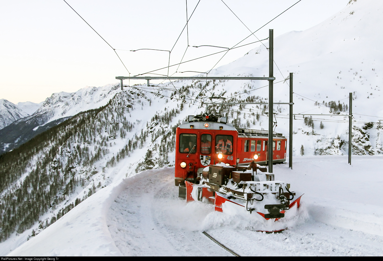 | Railcars ABe 4/4 # 48 and # 46 in multiple traction with the first train of the day from Poschiavo to St.Moritz, entering Alp Grüm shortly after 7 AM. In front of the railcars the flanger plow Xk 9144, which is remote controlled by the staff in the cab of the railcar # 48. |