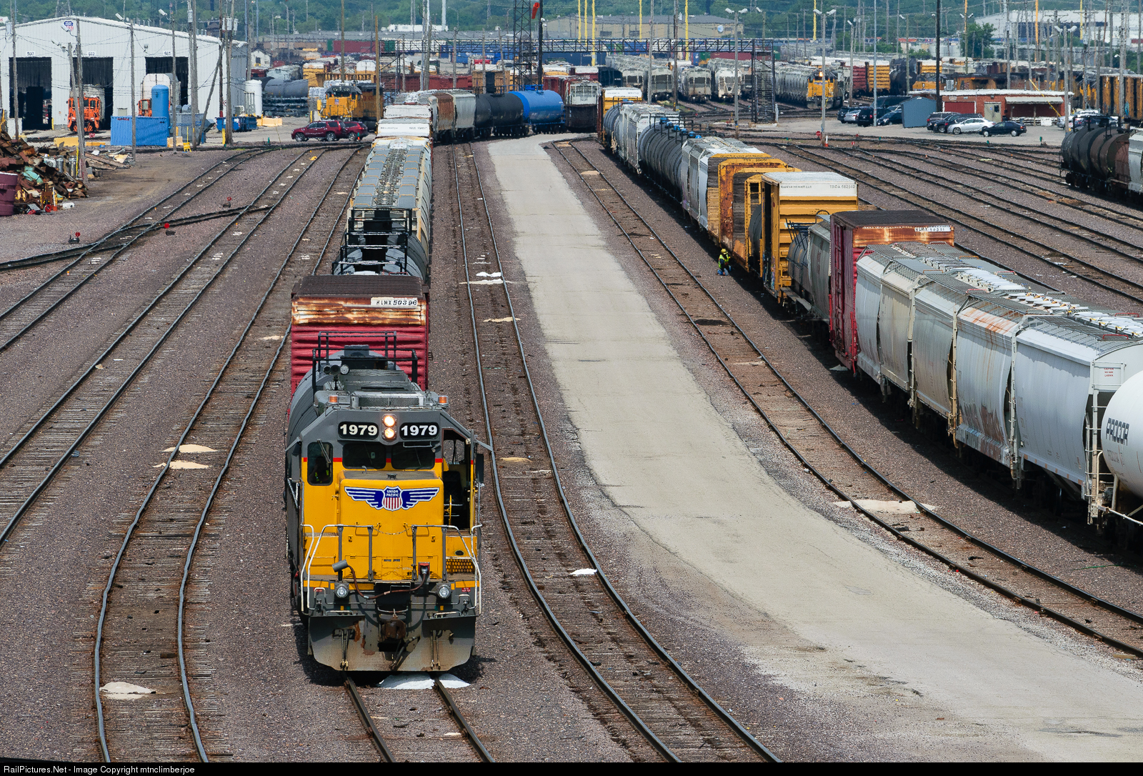 It's a busy morning at Union Pacific's Proviso Yard in Chicago. EMD SD40N 1979 is pulling down a cut of mixed freight as it builds a train for departure.