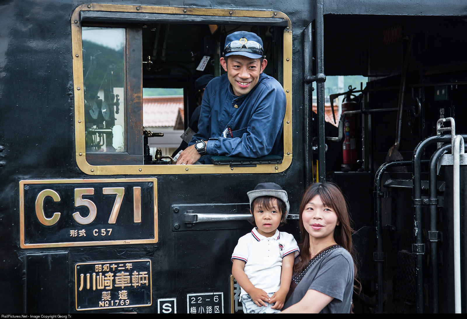 | Driver of the 4-6-2 "Pacific" steamlocomotive C57 # 1 of JR West (owned by the Umekoji Steam Locomotive Museum of Kyoto) is posing with passengers of the "Yamaguchi SL" steamtrain from Shin-Yamaguchi to Tsuwano in Niho station during the water stop. |