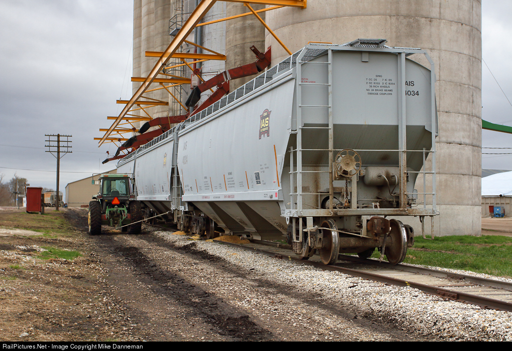 Tractor pull! Three covered hoppers dropped off at the grain elevator at Dexter, Iowa, on the Iowa Interstate Railroad are spotted by a reliable John Deere tractor. No need for a locomotive at this elevator. By the muddy markings along the track, the tractor has been busy moving cars!