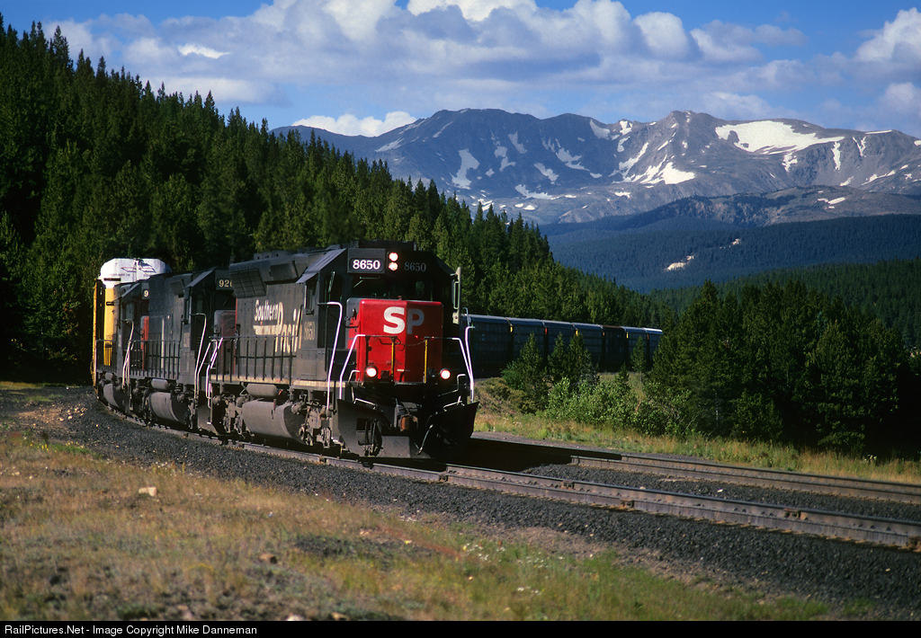Southern Pacific’s westbound KCOAF (Kansas City to Oakland Forwarder) has just arrived on top of Colorado’s scenic Tennessee Pass, on August 2, 1996. Two GE AC4400CW locomotives from the Minturn helper pool will soon arrive to help the road power with braking down the steep 3 percent western grade to Minturn at the bottom of the hill.
