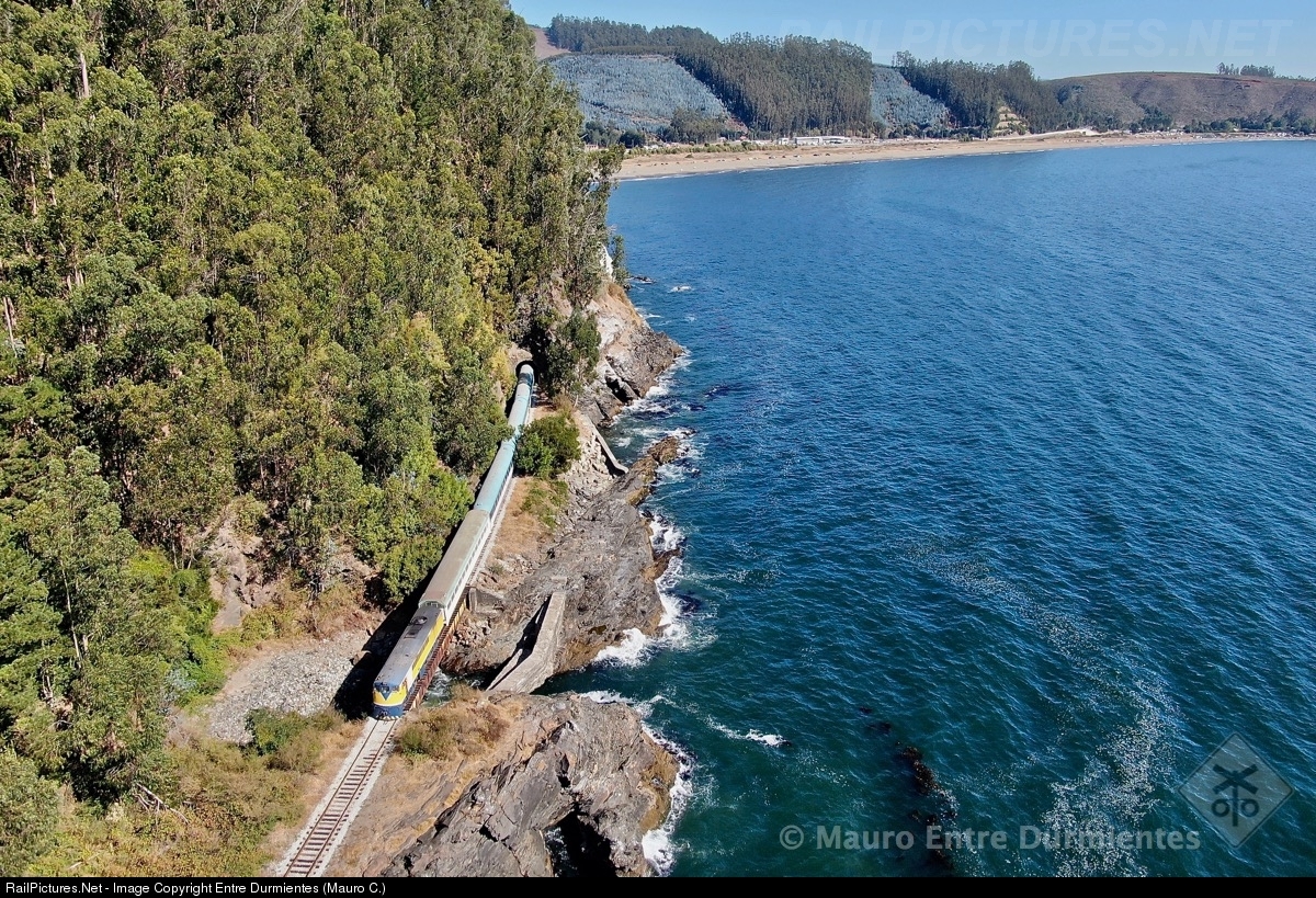 Very connected to the sea and coastal rocks, passenger train in tests, crosses tunnel 10 of subdivision 19 Concepción - Arauco line, bordering the Pacific Ocean with destination Concepcion on his return trip. In addition it is observed that the train crosses a bridge that is a sea entrance beyond the break.