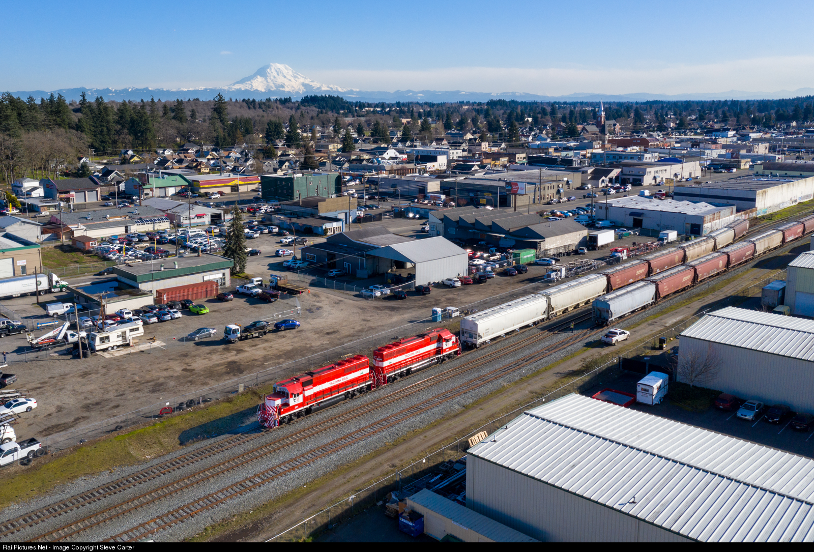 Tacoma Rail's twice weekly job 103 works the South Tacoma industries under the occasionally watchful eye of Mt Rainier on a beautiful winter day. The Feed Mill isn't quite finished but they need to clear up soon for the Sounder Fleet. So the next move is to set-out at Northwest Steel and Pipe and a plastics facility. The conductor has just stepped on and they are ready to go.