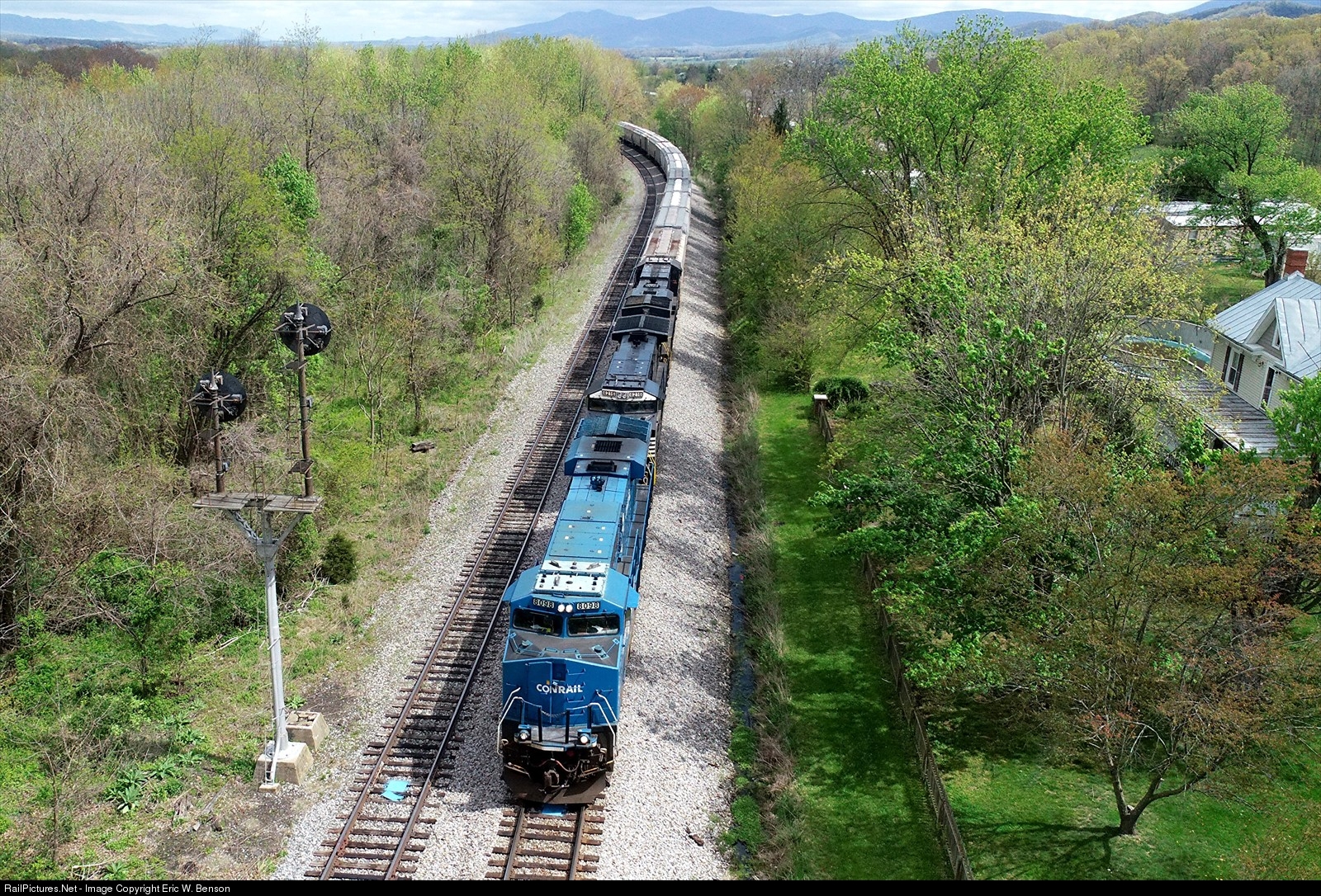 | Are you seeing BLUE? The NS Conrail unit was added in Vardo to the front of NS 42T and leads a grain train headed for the CW in Harrisonburg, VA. #716