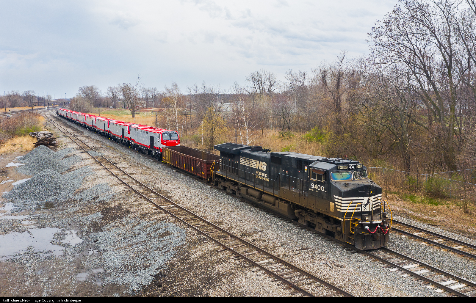 A train of brand new Wabtec/GE ES30ACi locomotives bound for export to Egypt, NS C90 waits for a crew on Dean Siding in Erie, Pennsylvania. NS C44-9W 9400 was dropped by westbound 149 in the morning to power this special move, and a crew from Conneaut would be taxied out in the afternoon to take the train west.