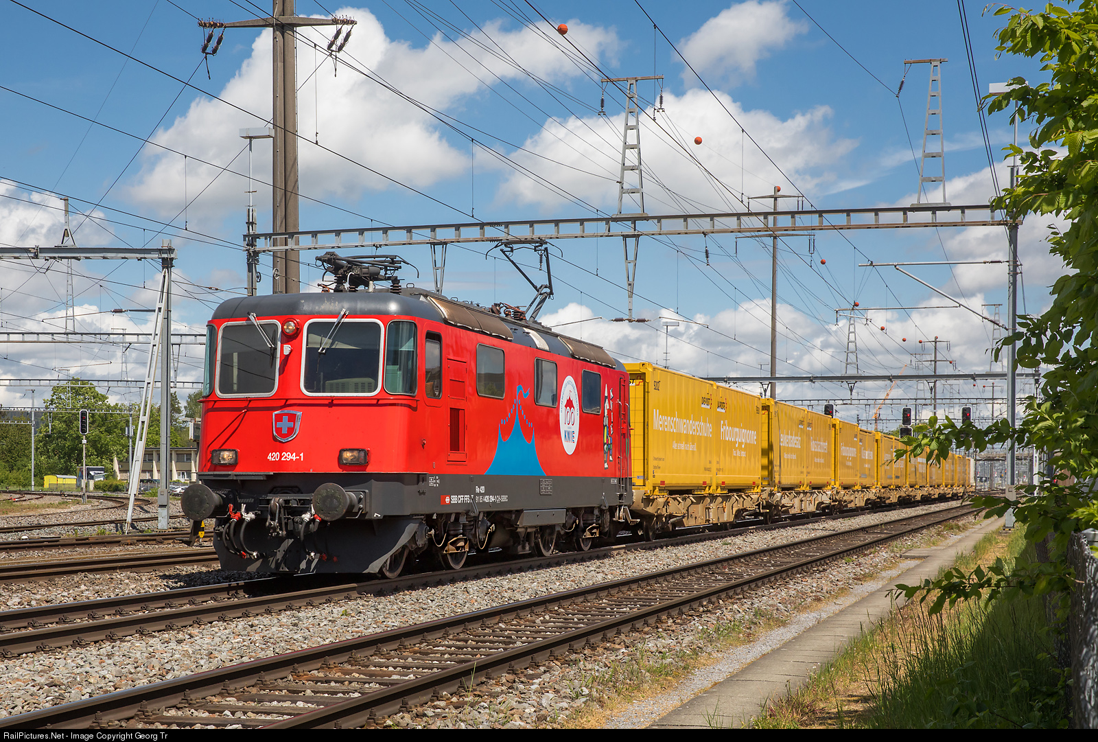Re 420 # 294 of the SBB got this special paint scheme in november 2018, to celebrate "100 years Swiss National Circus KNIE" (Knie is the family name of this traditional circus dynasty). The timeless motif with the clown balancing the big letters KNIE (Knie means knee in german) on his knee was created by the Swiss artist Herbert Leuppin in 1956 and has since become the most famous symbol of the Swiss National Circus. In the anniversary year 2019, the circus KNIE had the best season ever, but this year, with the Corona crisis, the circus is forced to remain inactive at its home base in Rapperswil until further notice and will probably not be able to start the tour until September. Re 420 # 294 is pulling the parcel mail train 50072 from Frauenfeld sort center via Härkingen to Daillens through Oberwinterthur.