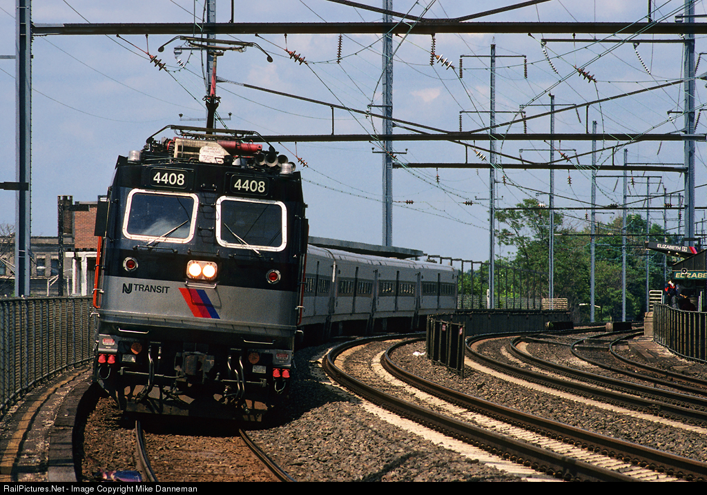 | New Jersey Transit ALP44 No. 4408 leads a southbound commuter train through the curve at Elizabeth, New Jersey, on May 21, 1993. |