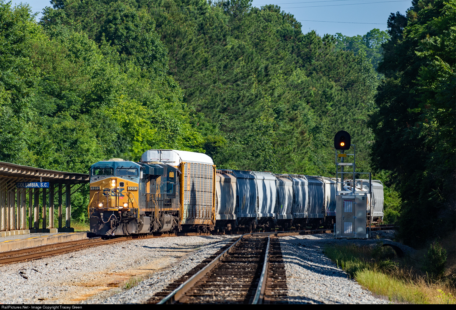 | Approach Columbia. Pre-COVID 19, this freight typically was a long train with a few mixed freight cars and mostly autoracks otherwise. But since the economic slowdown, F779 has gotten smaller and smaller with few to no autoracks. Here, F779 runs through Columbia's Ditch and past the Amtrak Station on its way to Cayce Yard just across the Congaree River. |