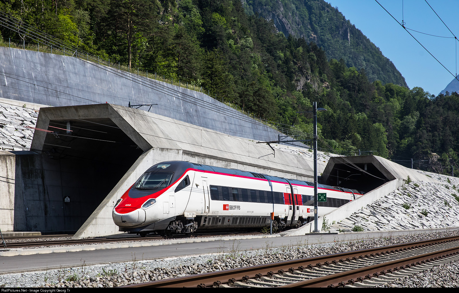 | Highspeed tilting trai ETR 610 # 005 of the SBB is leaving the 57 kilometer long Gotthard Base Tunnel (GBT) at Rynächt near Erstfeld, running the Eurocity 318 from Chiasso (not from Milan in the covid-19 timetable) to Zürich. |