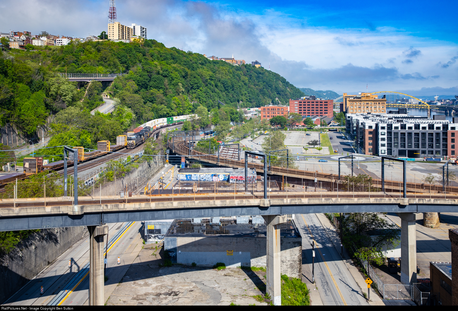| Southbound 20Q rides next to another southbound C35 along Carson Street up above the Southside on a beautiful Pittsburgh, Pennsylvania morning on the NS Mon Line.