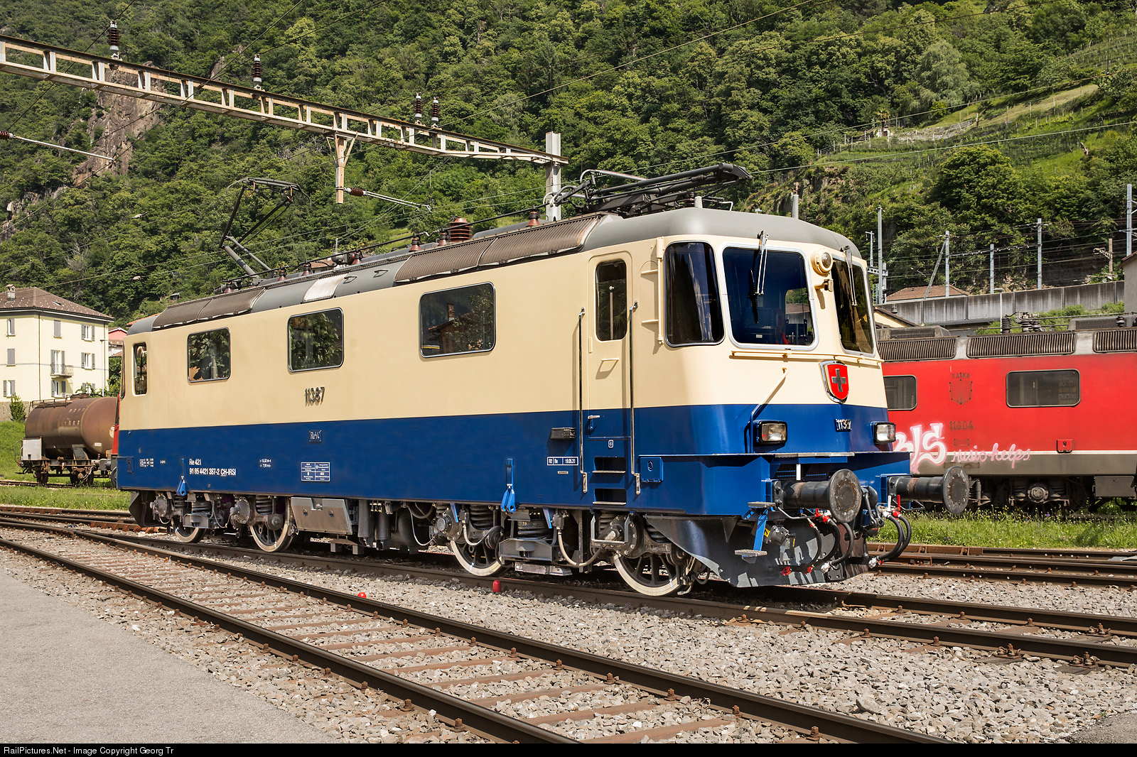 More then two weeks ago, in the industrial plant (IW = Industriewerk) of the SBB in Bellinzona, this locomotive was handed over to the IRSI after a revision with new paint scheme. It is still standing there and was not seen on the line til now. In autumn 2019, the IRSI (International Rolling Stock Investment Gmbh) from Frauenfeld bought the two Re 421 # 387 and # 393 from SBB Cargo, mainly for the sugar beet traffic. The former Re 4/4 II # 11387 and # 11393 were rebuilt to Re 421 with approval to run in Germany and Austria too in 2002/2005. This year, first the Re 421 # 393 (former Re 4/4 II 11393 of the SBB) got a revision R2 in the industrial work Bellinzona and was finished in february in the former TRANS EUROP EXPRESS colors red/cream. On may 19th, 2020, the second locomotive was handed over to the IRSI in Bellinzona after revision R2, the Re 421 # 387 (former Re 4/4 II # 11387) in a elegant steel blue/cream paint scheme, sympathized with the express train "Rheingold" (Amsterdam-Basel) colors of the years 1962 to 1965 (the Rheingold used cobalt blue/cream). The "Rheingold" was the fastest train of the Deutsche Bundesbahn at this time with a maximum velocity of 160 km/h. Initially, in Germany six locomotives of the class E 10 (with "angular" ends, E 10 # 1239 to # 1244) were used as traction units, which were given special bogies designed for 160 km/h and painted in cobalt blue/cream to match the cars for their special operations. The class E 10.12 electric locomotives that were actually intended for the Rheingold with the more elegant front ("Bügelfalte") (crease form), whose colour scheme corresponded to that of the cars from the beginning, were used when delivered from autumn 1962. The provisionally used locomotives were then rebuilt to normal E 10. The "Rheingold" was then classified as TEE (TRANS EUROP EXPRESS) from summer timetable 1965 and prolonged from Basel to Geneva. In Switzerland, the train was pulled by a green Re 4/4 I and there was not a appropriate locomotive in term of colors available for the cobaltblue/cream cars. The cars were soon painted red/cream (about 1966/67) and in Switzerland, the Re 4/4 I # 10033, 10034, 10046 und 10050 got an appropriate red/cream paint scheme for this service not until 1972. In the background of the picture is the former SBB Re 6/6 # 11604 "Faido" prototype built in 1972, not operational in the moment, and sold to the RailAdventure. The future of this locomotive is not decided yet. Sister # 11603 (Re 620 # 003) is operational for RailAdventure.