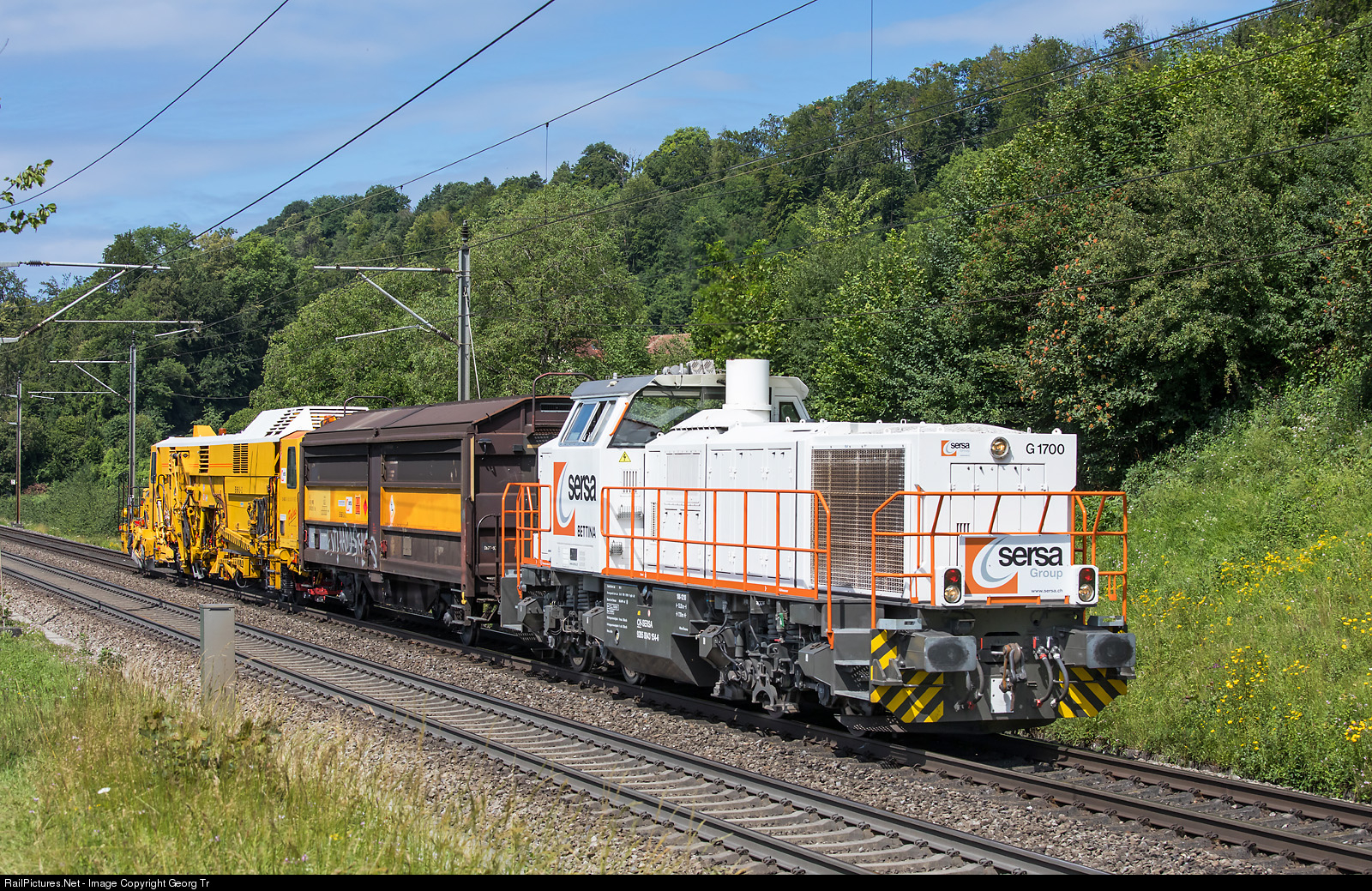 | Diesellocomotive Am 843 # 154 "BETTINA" of the Sersa (SMG Sersa Maschineller Gleisbau), a Vosslok G 1700-2 BB, built in 2003 and bought from the Mittelweserbahn in 2009, is pulling a tools car and the B 66-U2 tamping machine from Basel freight yard to Zürich Vorbahnhof, on the Bözberg south ramp near Umiken. |