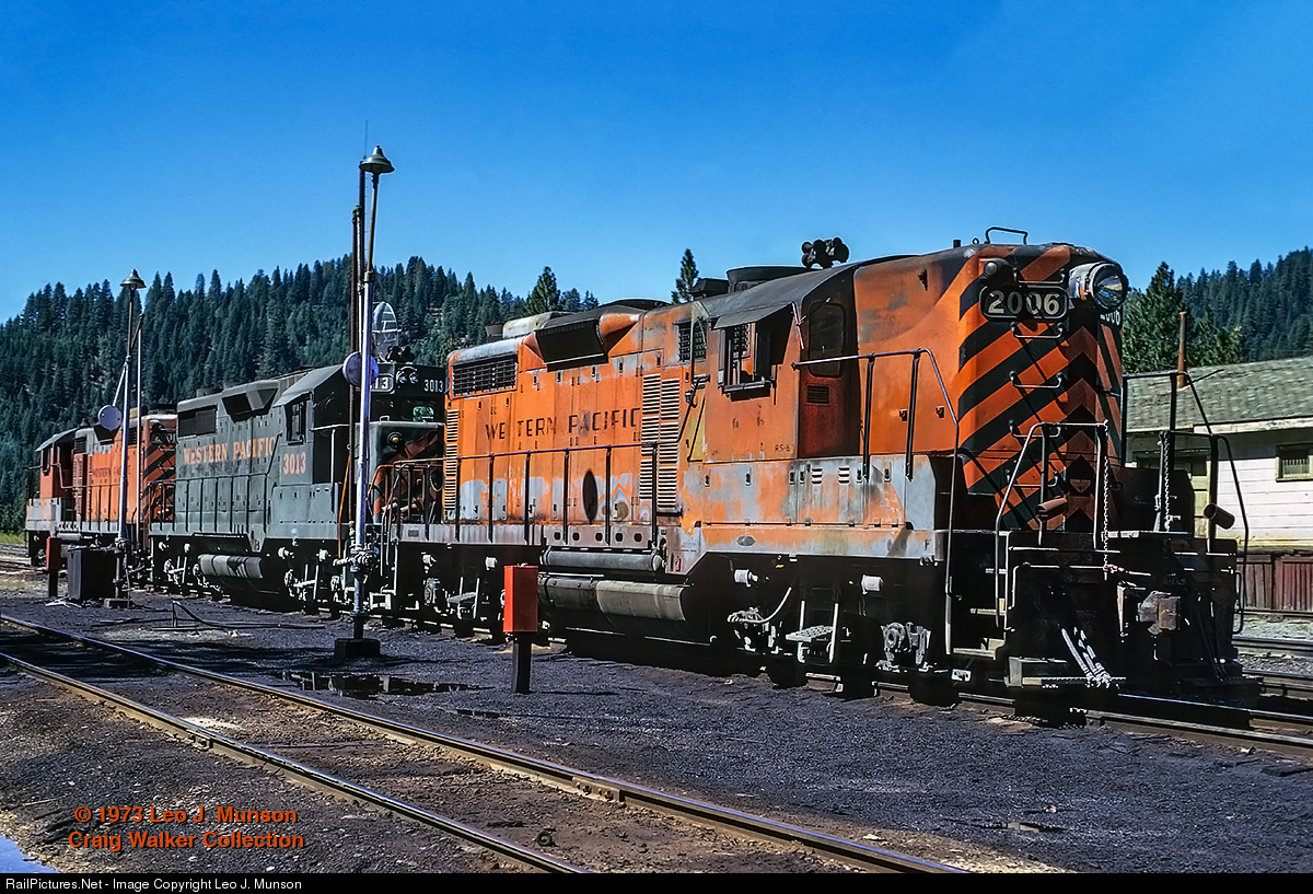 A trio of Western Pacific locomotives was found in the engine servicing section of the railroad’s Keddie, California, facility on September 2, 1973. GP20s 2006 and 2001 are bracketing GP35 3013.