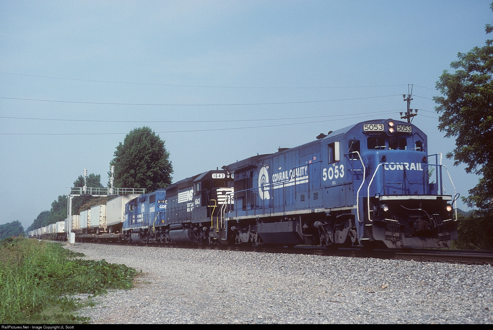 NS 212 heads north at "Beaumont", where the mainline goes from double to single and the W-Line splits off toward Columbia. 1999 was a great year to shoot the NS with all kinds of exotic consists. Here we find a Conrail B36-7 leading a former N&W SD40-2 (NS 1643) and a Conrail GP38-2 (CR 8191).