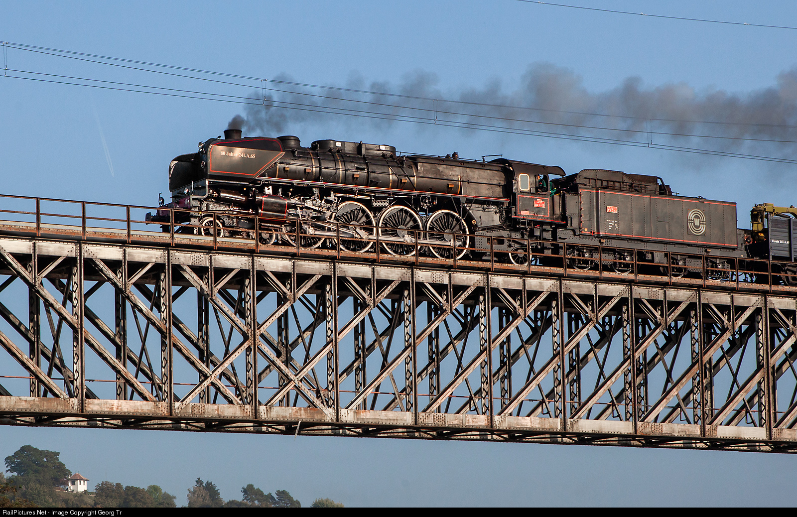 | Eighty years old former french railway SNCF four cylinder compound steamlocomotive 241 A # 65 (4-8-2) is crossing the river Rhine on the 262 meter long bridge which was built in 1895. The locomotive is based in Full/Argovie and owned and operated by association "241-A-65". It made a round journey in eastern part of Switzerland with a charter train for a birthday party. This year, the locomotive will be 90 years old, but is not operational in the moment. |