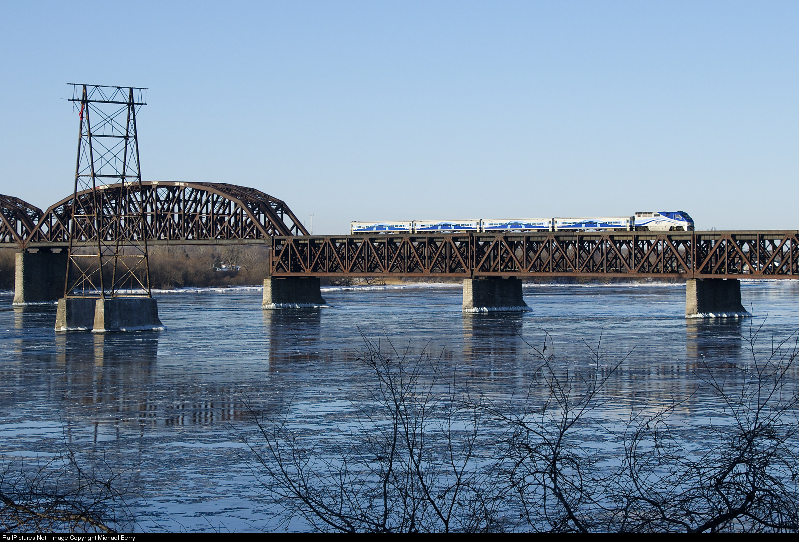 EXO 78 is about ten minutes ahead of CP 253 as it approaches Lasalle Station on CP's impressive bridge over the St. Lawrence River.