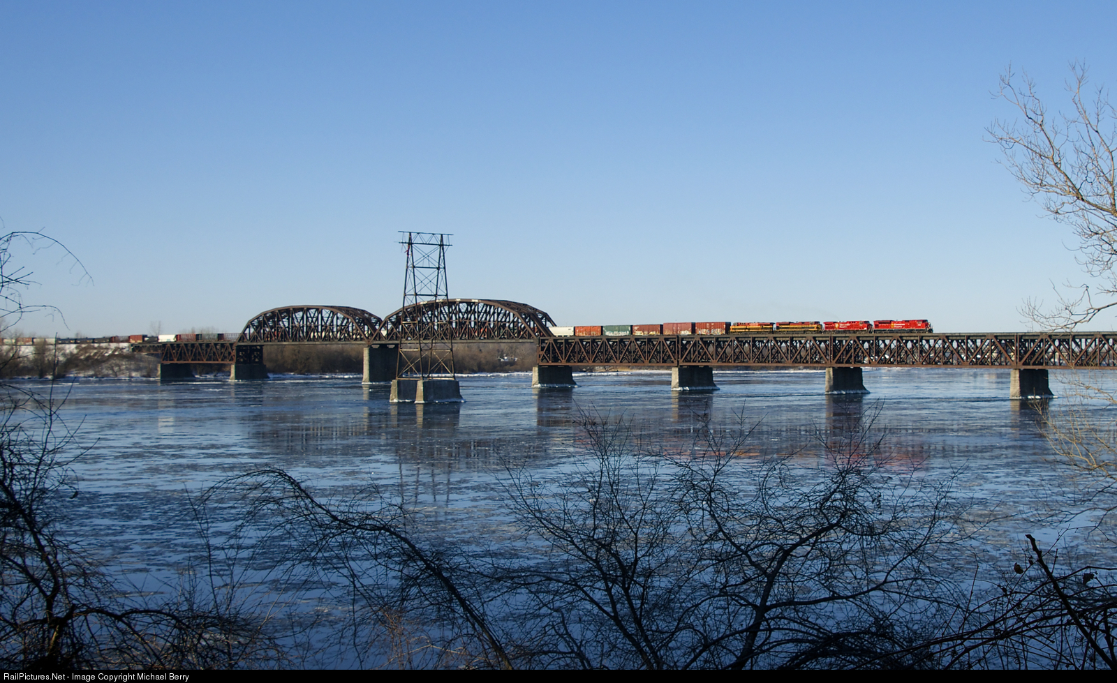 | CP 253 is crossing the St. Lawrence River with a split CP/KCS lashup (CP 7033, CP 9633, KCS 4143 & KCSM 4677). |