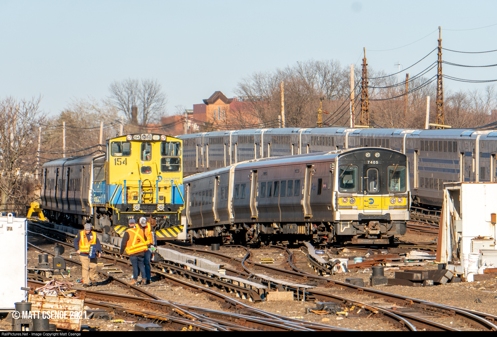 LIRR trains depart Jamaica Station for points east while a maintenance crew performs minor work in the complex interlocking east of the station. the MP15AC locomotive is a protect unit, ready in case a train breaks down in this critical area. |